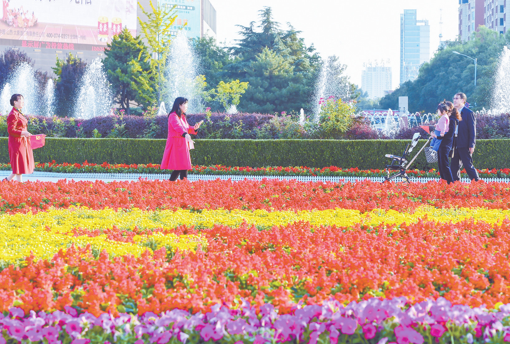 近日,长治市八一广场,市民在赏花拍照。 记者 梁栋 摄