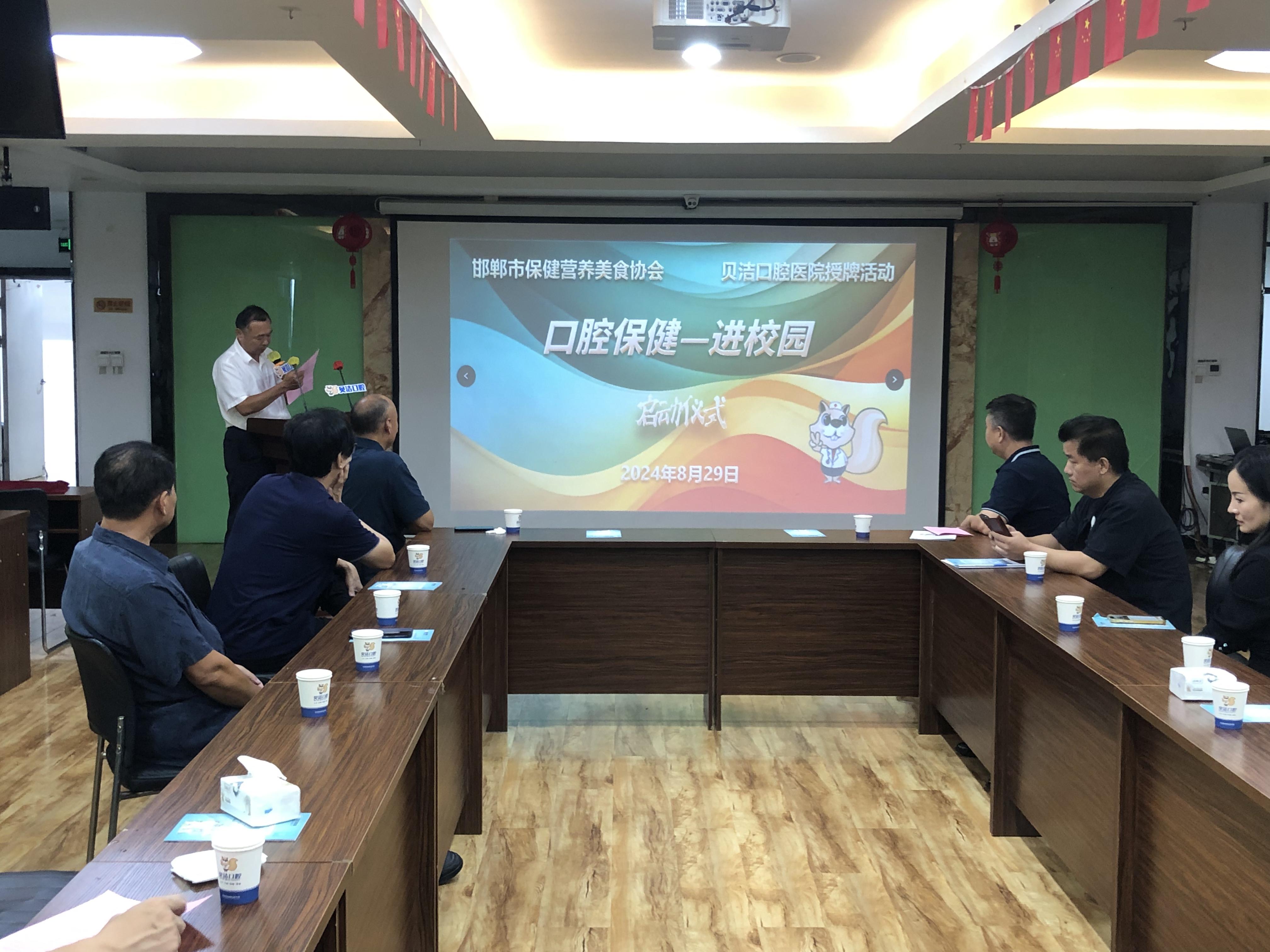中原网讯:(采编 武键)8月29日,在全国科普日即将到来之际,邯郸市保健营养美食协会联合贝洁口腔医院,在贝洁口腔医院多功能会议厅开展了授牌活动暨“口腔保健进校园”启动仪式。启动仪式现场邯郸市科学技术协会副主席王啸淳做主题讲话、特邀原邯郸市民政局副局长、邯郸市社促会会长李政朝和邯郸市保健营养美食协会会员单位负责人出席本次活动。