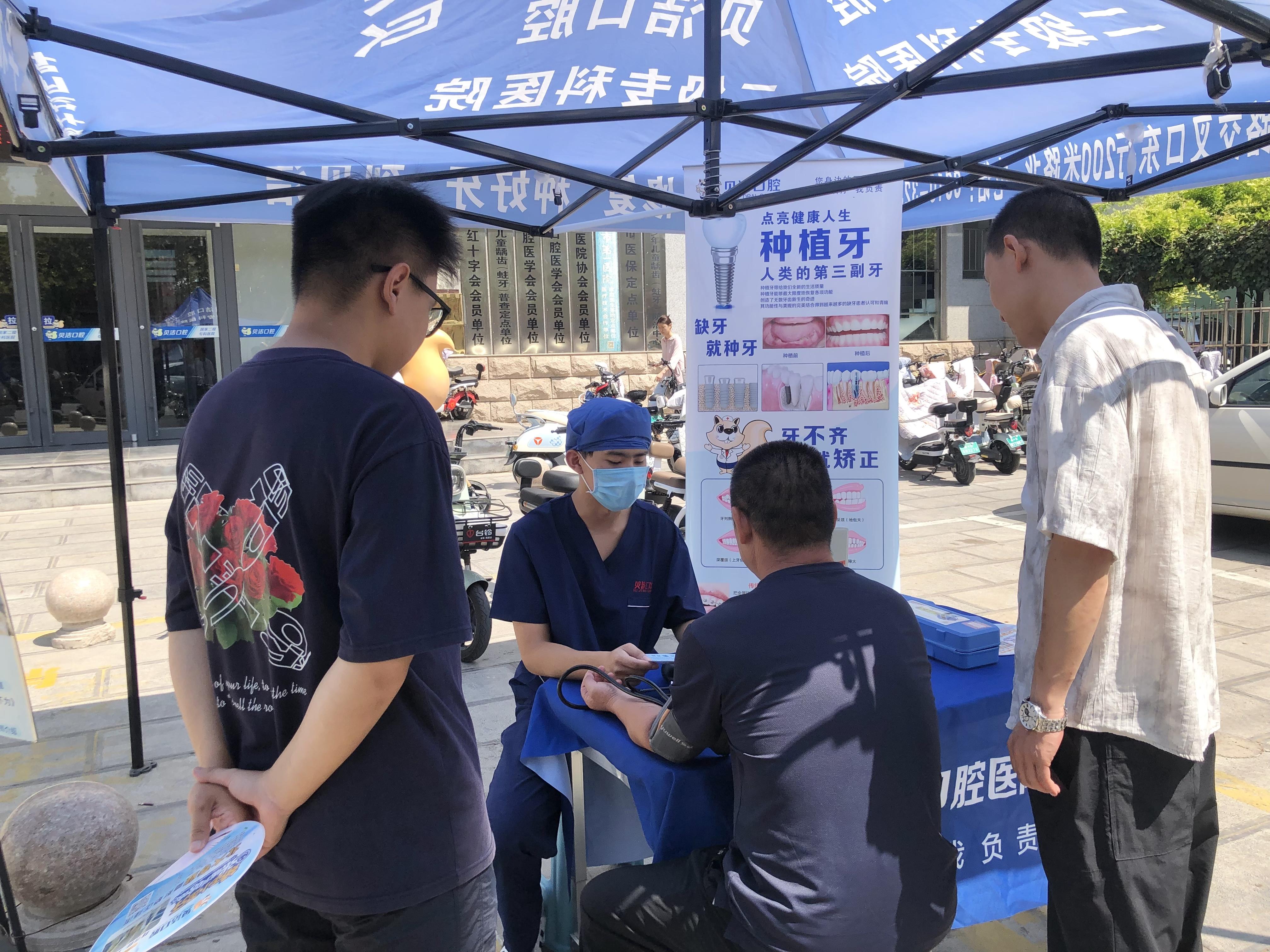 活动中,医务人员还通过在室外设置展牌展台营造宣传氛围,为过往群众免费测量血压,发放口腔健康科普宣传资料,答疑解惑,引导群众形成健康的生活理念。