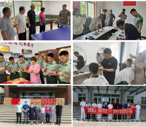 在邯郸军分区等驻邯部队,邯郸市企业联合会及其会员单位邯郸泓言慧盛健康管理有限公司、邯郸圣济医院、邯山区福泰贸易商行、邯郸市学步桥食品有限公司为部队官兵赠送慰问品;邯郸市乒乓球协会与部队官兵进行了乒乓球现场互动,并与武警支队官兵达成常态化指导交流意向;邯郸市美容美发协会选派明星理发师为武警邯郸支队和驻邯某部官兵理发,官兵们纷纷表示,能在营区享受到“大咖”级别的待遇,非常高兴;在驻邯通讯连邯郸市硬笔书法家协会会长王旭东带领书法家为官兵进行书法创作指导并进行书法知识讲座、现场赠送了“精忠报国”等书法作品,赢得了官兵的赞叹!在驻邯部队,邯郸市妇女手工业协会现场展示文创产品、赠送慰问品、传授非遗手工技艺,让大家感受到了邯郸历史文化名城的历史文化底蕴和邯郸巾帼不让须眉的创新精神;在部队驻地,邯郸社会组织把健康送到官兵身边,在邯郸明仁医院为一等功臣免费体检、邯郸市保健营养美食协会为官兵开展营养配餐、健康知识交流座谈、探讨了军地双方在健康及营养配餐合作的意向。