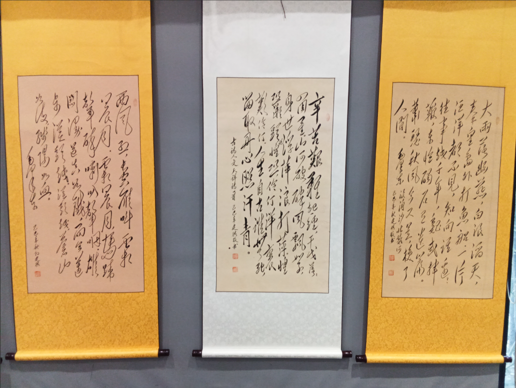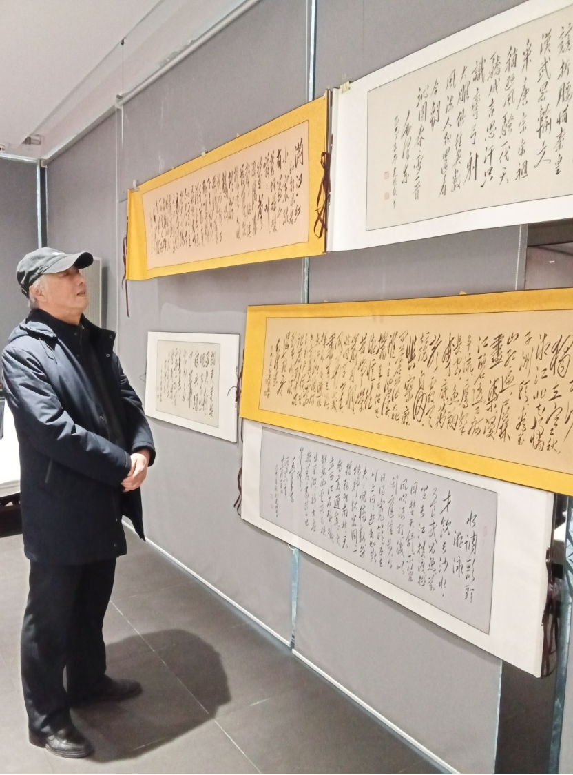 张建琪老师多年来潜心研习毛体书法,其作品笔力遒劲、气势雄浑,现场五十余幅作品精心陈列,既有毛泽东诗词名篇的恢弘再现,也有其经典语录的笔墨凝聚。不仅保留了毛体特有的豪迈与飘逸,又融入了个人对伟人精神的理解与致敬,充分展现出深厚的艺术功底与情感投入。