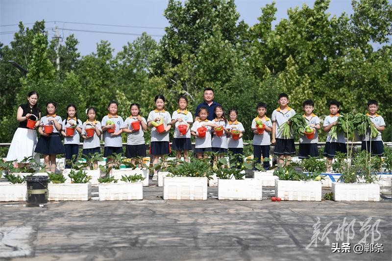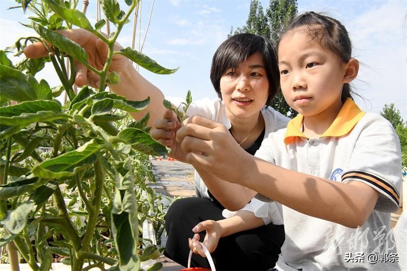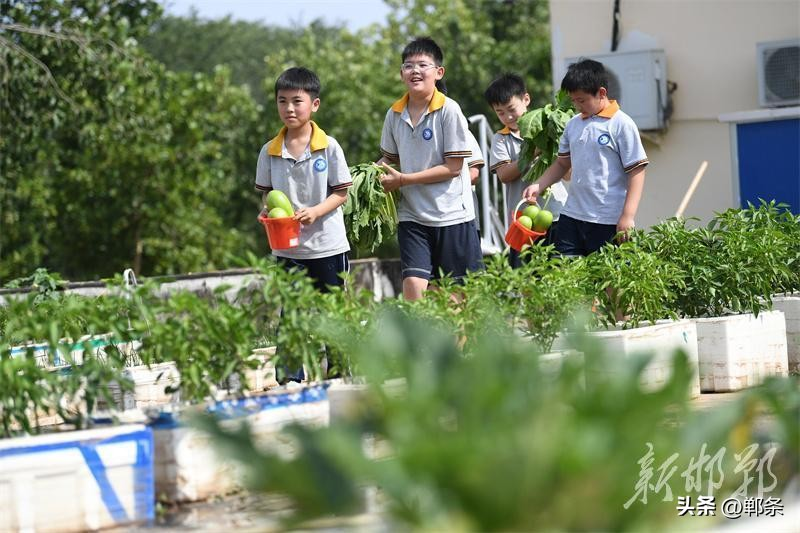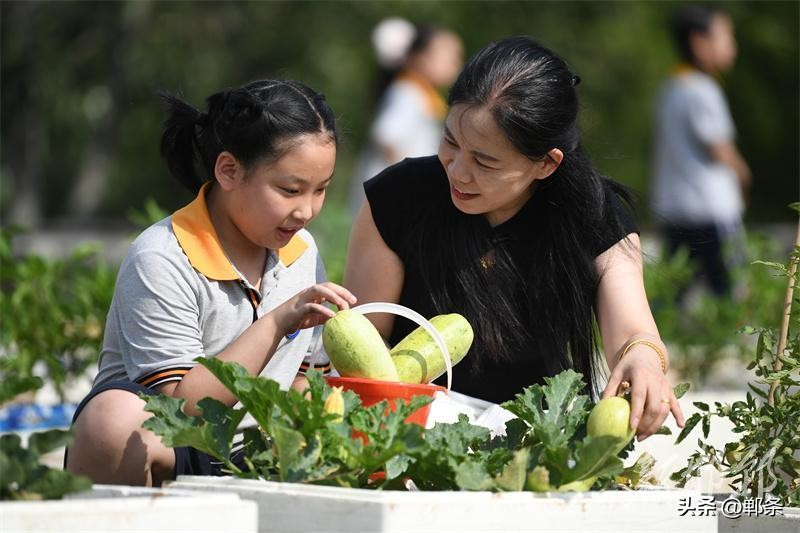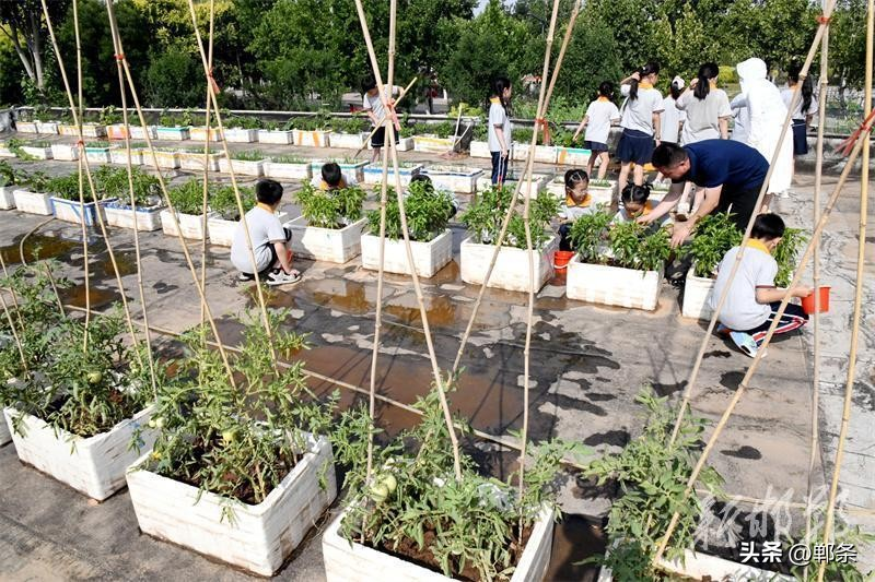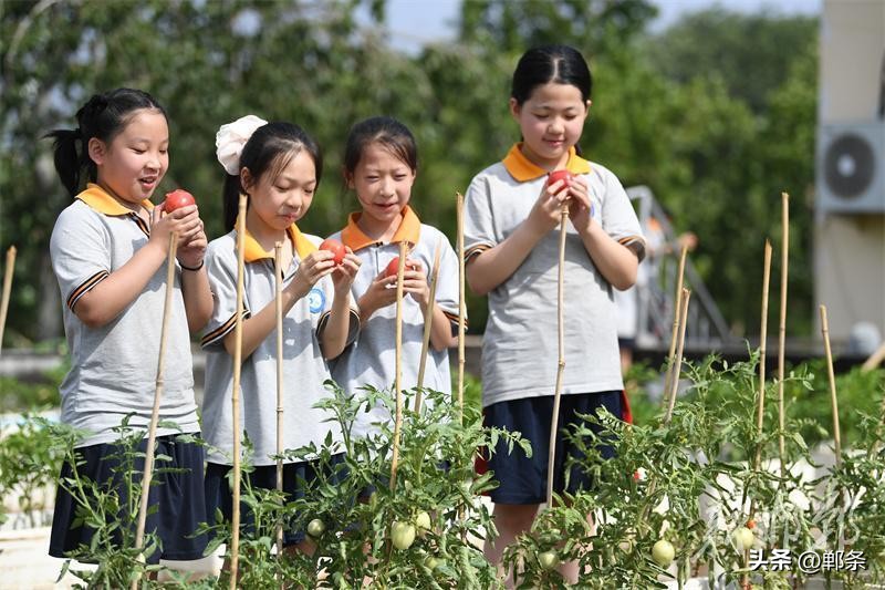 6月18日,邯郸市广平县第一实验小学的“空中农场”,小学生在老师的指导下管理种植的蔬菜。邯郸市广平县第一实验小学2024年在教学楼楼顶开辟了“空中农场”,占地面积约500平方米,里面可种植蔬菜、玉米、小麦等。学校定期在“空中农场”开设农耕课堂,组织小学生体验整地、播种、除草、施肥、采摘、收获等过程,让孩子们体验农耕的乐趣,懂得珍惜劳动成果。 程学虎