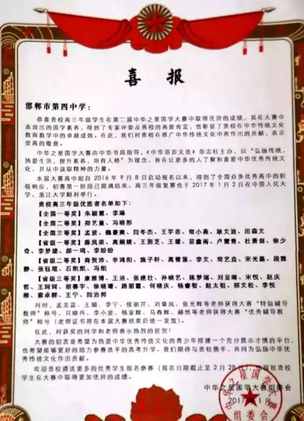 邯郸市四中继承办第二届中华之星国学大赛决赛后,今又传来获奖喜讯,有11位同学获得国家级奖励,42位同学获得省级奖励,并有11位老师荣获“优秀辅导教师”称号。‹点击详情› -
